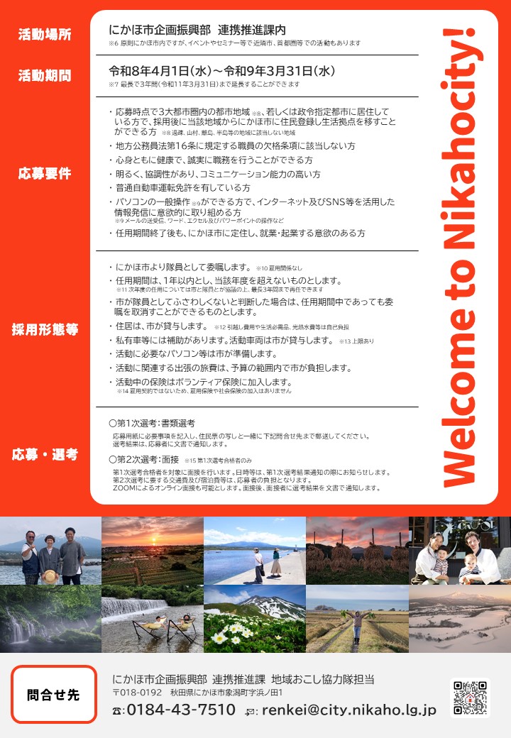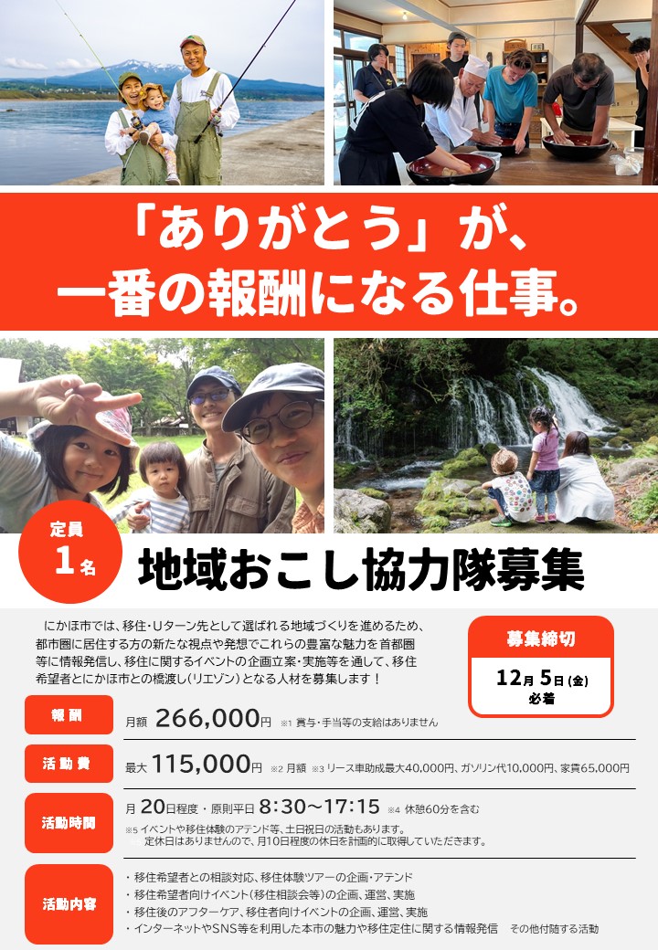 ・応募時点で3大都市圏内の都市地域(過疎、山村、離島、半島等の地域に該当しない地域)、若しくは政令指定都市に居住している方で、採用後に当該地域からにかほ市に住民登録し生活拠点を移すことができる方